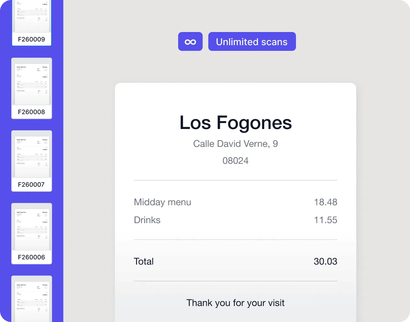 Choose the plan that best suits you: all of them include unlimited scanning. Just upload your tickets or invoices and our AI will capture, verify and categorize every detail.