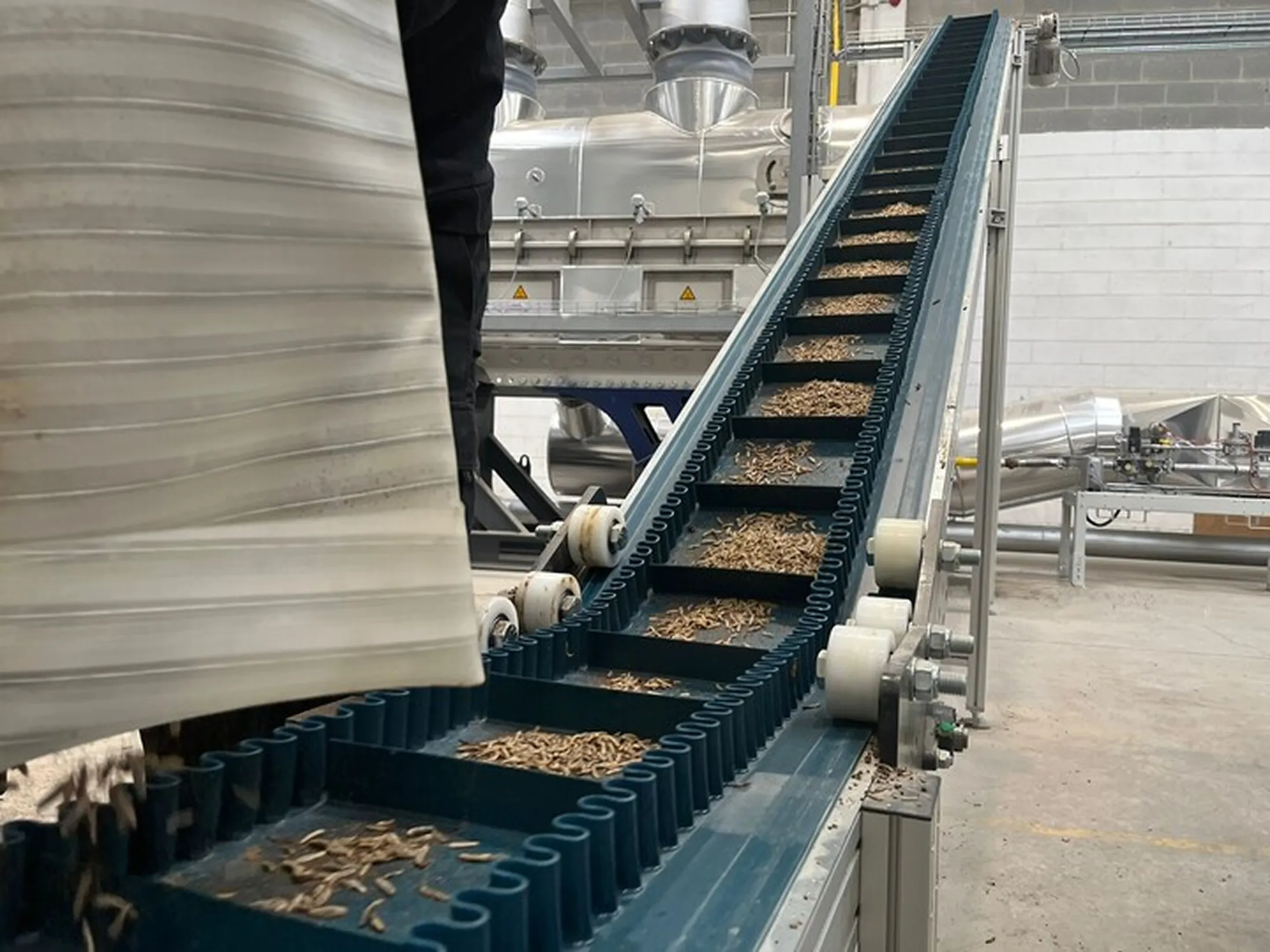 En la nave de Abrera alimentan esas larvas neonatas con subproductos derivados de la industria alimentaria —pieles de patata, pulpas de fruta, el alperujo resultante de la extracción del aceite de oliva…— y, tras engordarlas, se obtiene la proteína para la alimentación animal de manera circular y eficiente. Se aprovecha todo. Una parte, los excrementos de los gusanos, servirá para abono. La larva deshidratada se convierte en harina que se transformará en pienso para animales.
